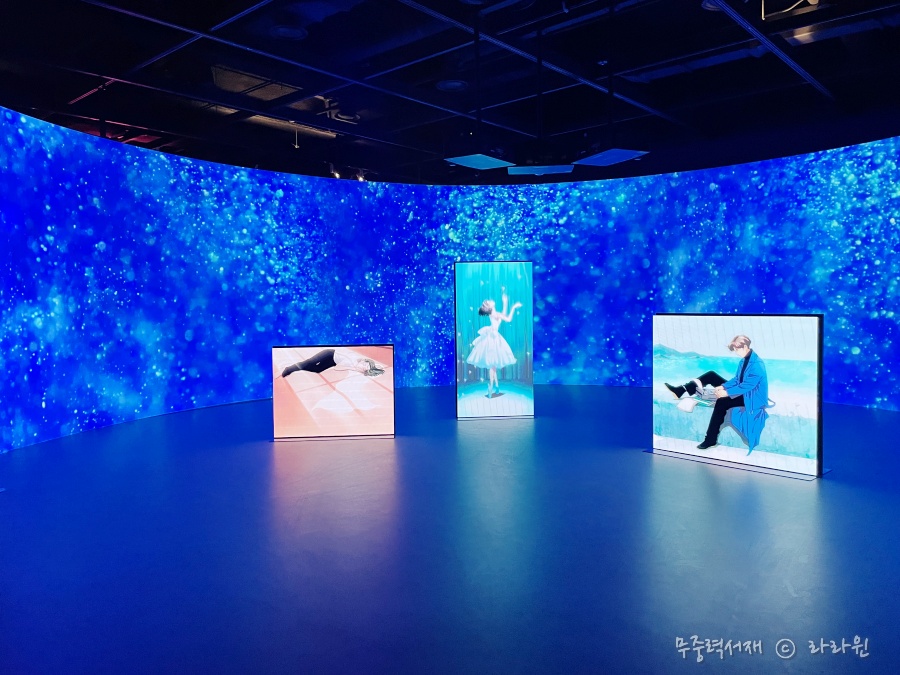 이은혜 작가님의 블루. 음악, 살랑이는 화면. 배경의 디지털 아트, 너무 좋았다. 이 순간 나 말고 여기 혼자 서 있는 누군가가 있다면 정말 반했을 지도 모르겠다. (하지만 없었지...)