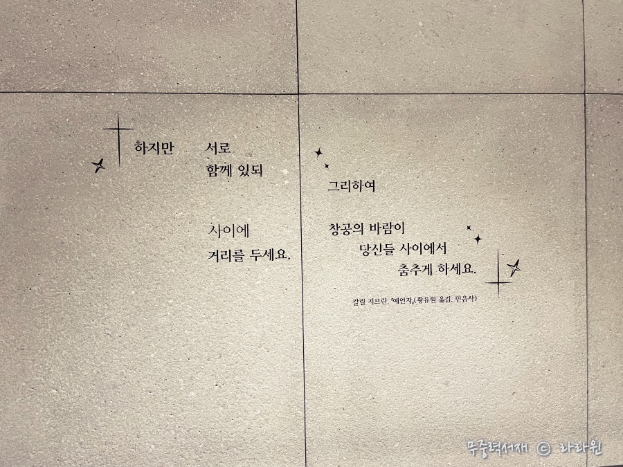 "서로 함께 있되, 사이에 거리를 두세요. 창공의 바람이 당신들 사이에서 춤출 수 있도록"